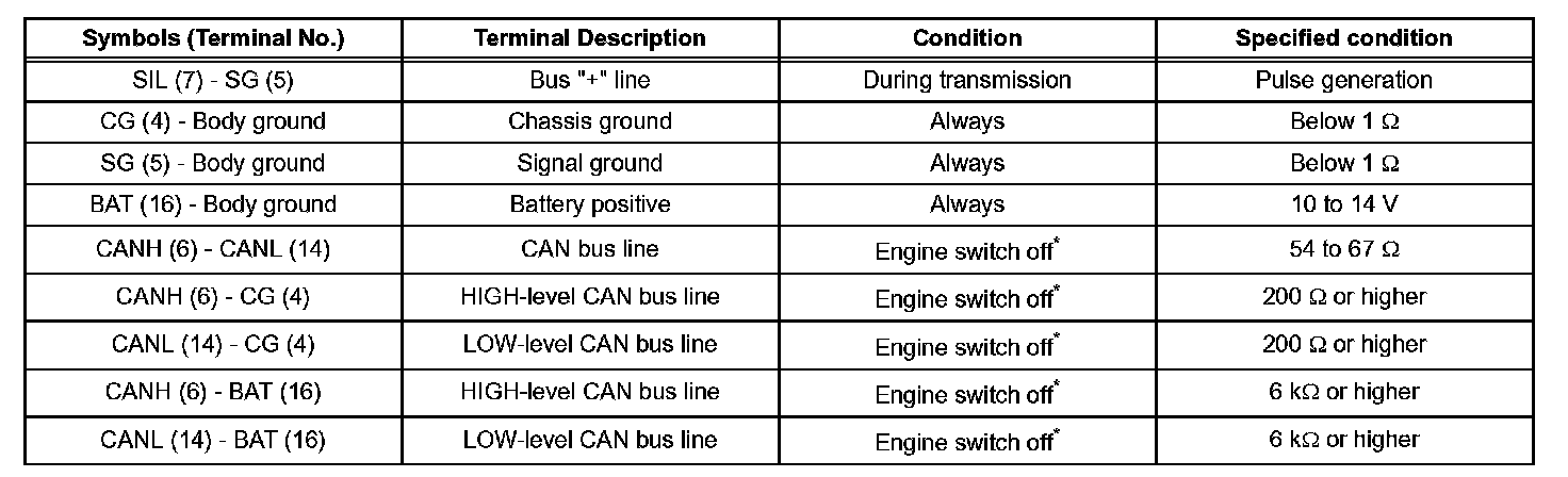 NOTE: *: Before measuring the resistance, leave the vehicle as is for at least 1 minute and do not operate the engine switch, any other switches or the doors. If the result is not as specified, the DLC3 may have a malfunction. Repair or replace the harness and connector.