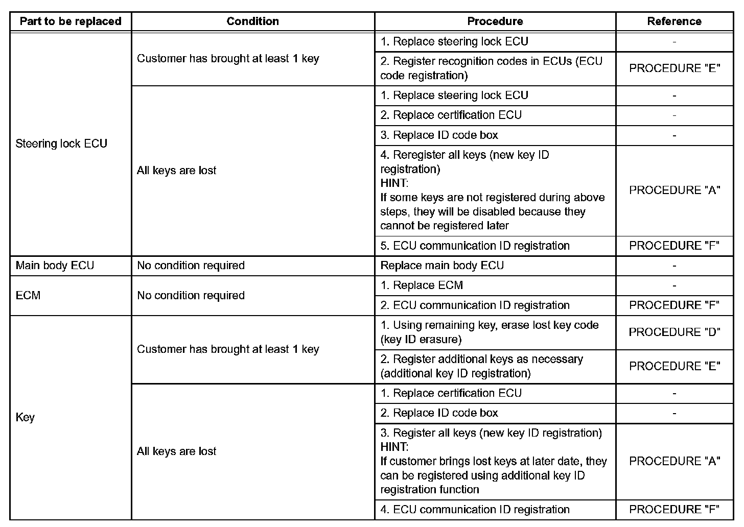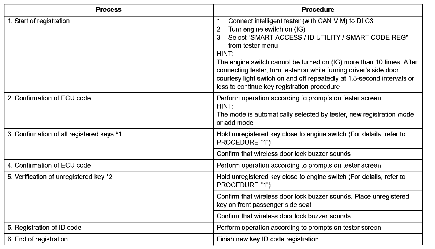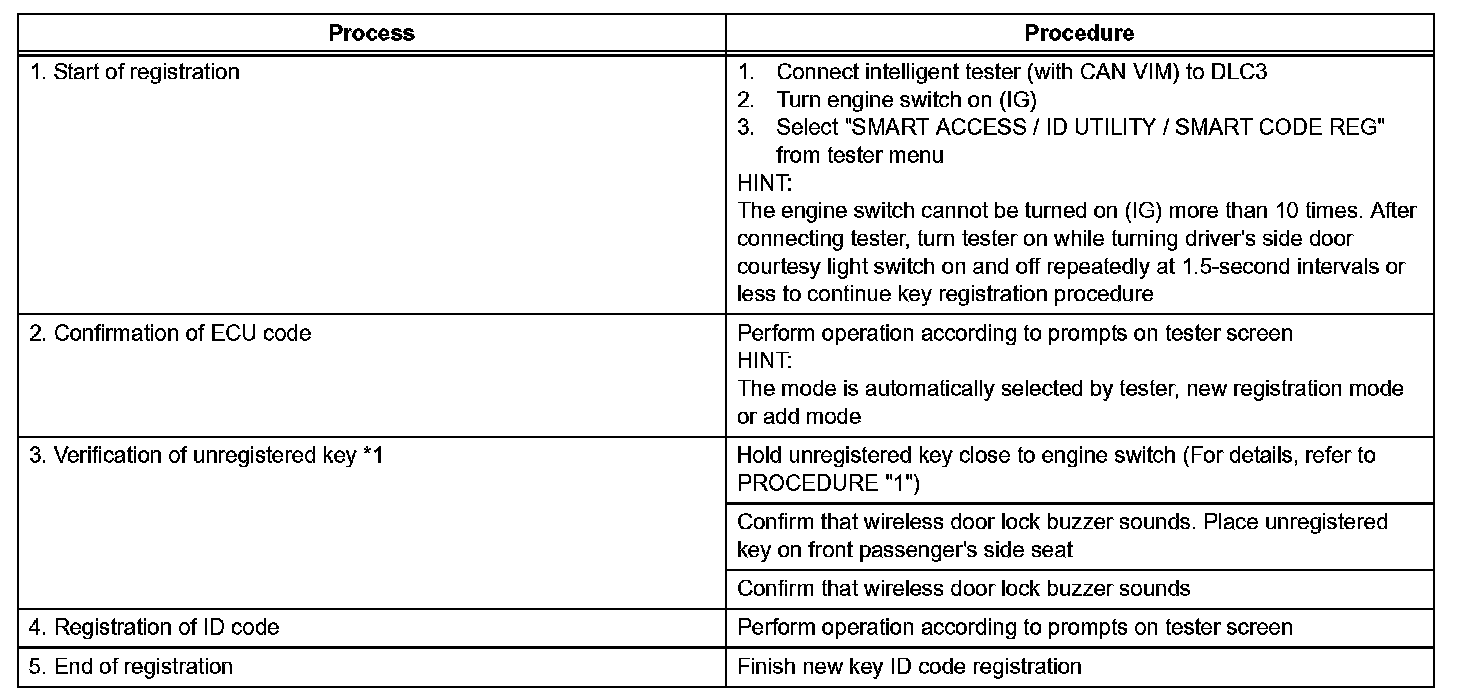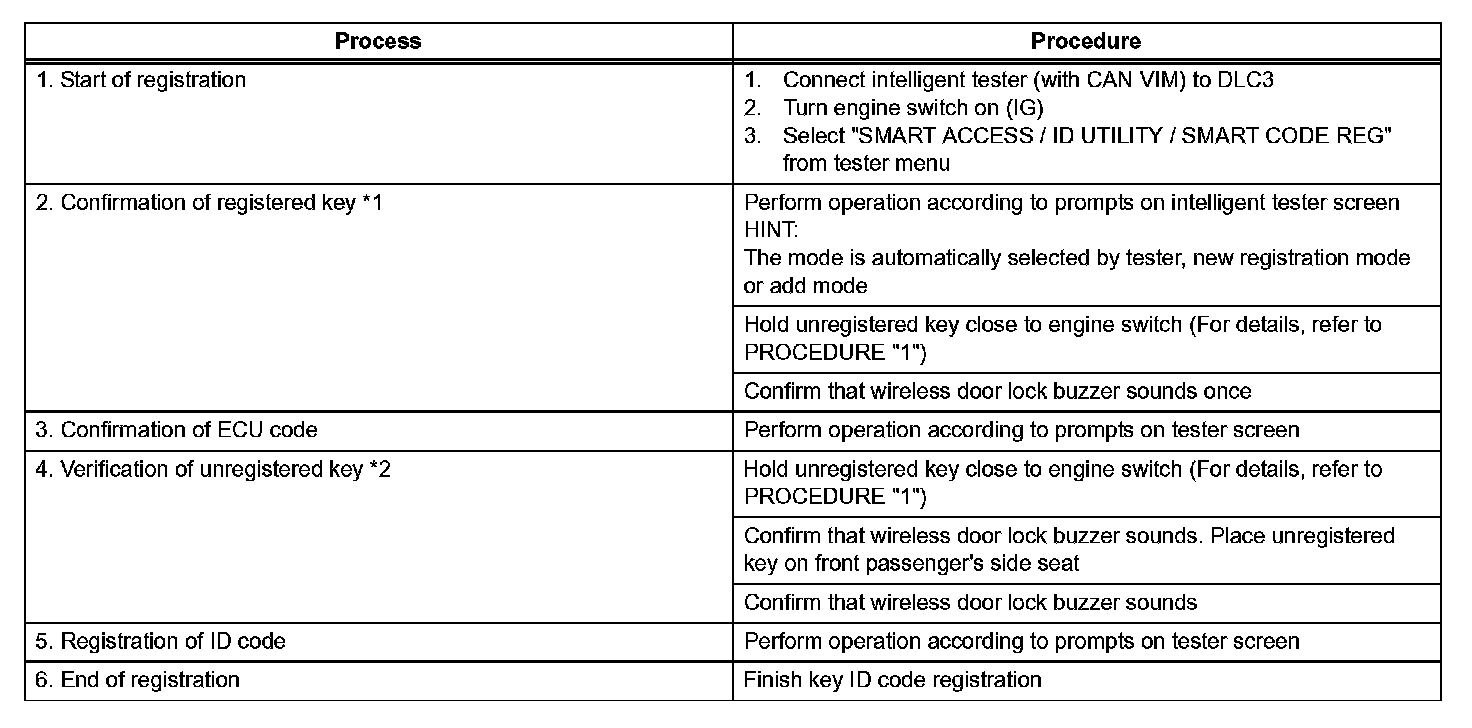- The given procedures indicated in the table require the use of the intelligent tester: New key ID registration Additional key ID registration Key ID erasure ECU code registration.
