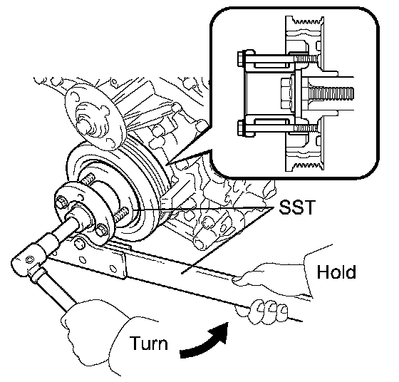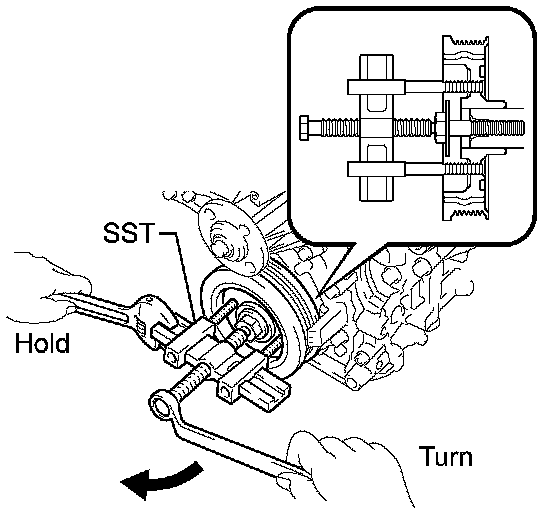 (b) Using SST, remove the crankshaft pulley bolt and crankshaft pulley