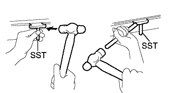 (b) Insert the blade of SST between the oil pans. Cut through the applied sealer and remove the No. 2 oil pan sub-assembly.