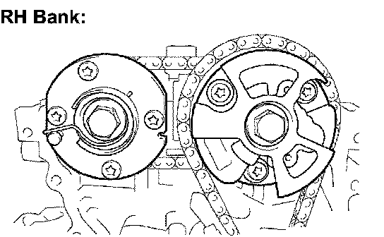 (d) Turn the camshaft timing gear assembly on the RH bank clockwise (approximately 60°) and set it as shown in the illustration. Be sure to loosen the chain between the banks.