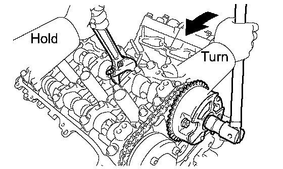 (b) Hold the hexagonal portion of the camshaft with a wrench, and remove the 2 bolts and 2 camshaft timing gear assemblies.
