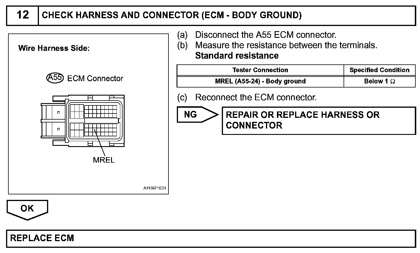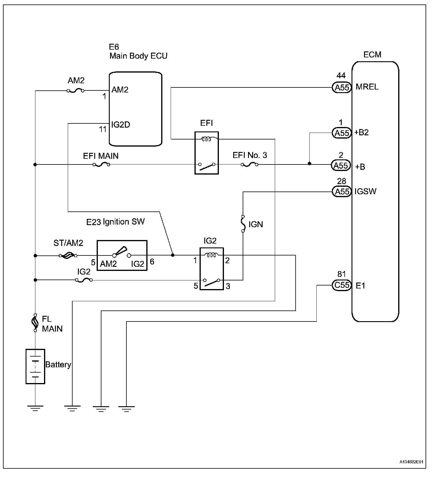 The ECM MREL output signal causes a current to flow to the coil, closing the contacts of the EFI MAIN relay and supplying power to terminal +B of the ECM.