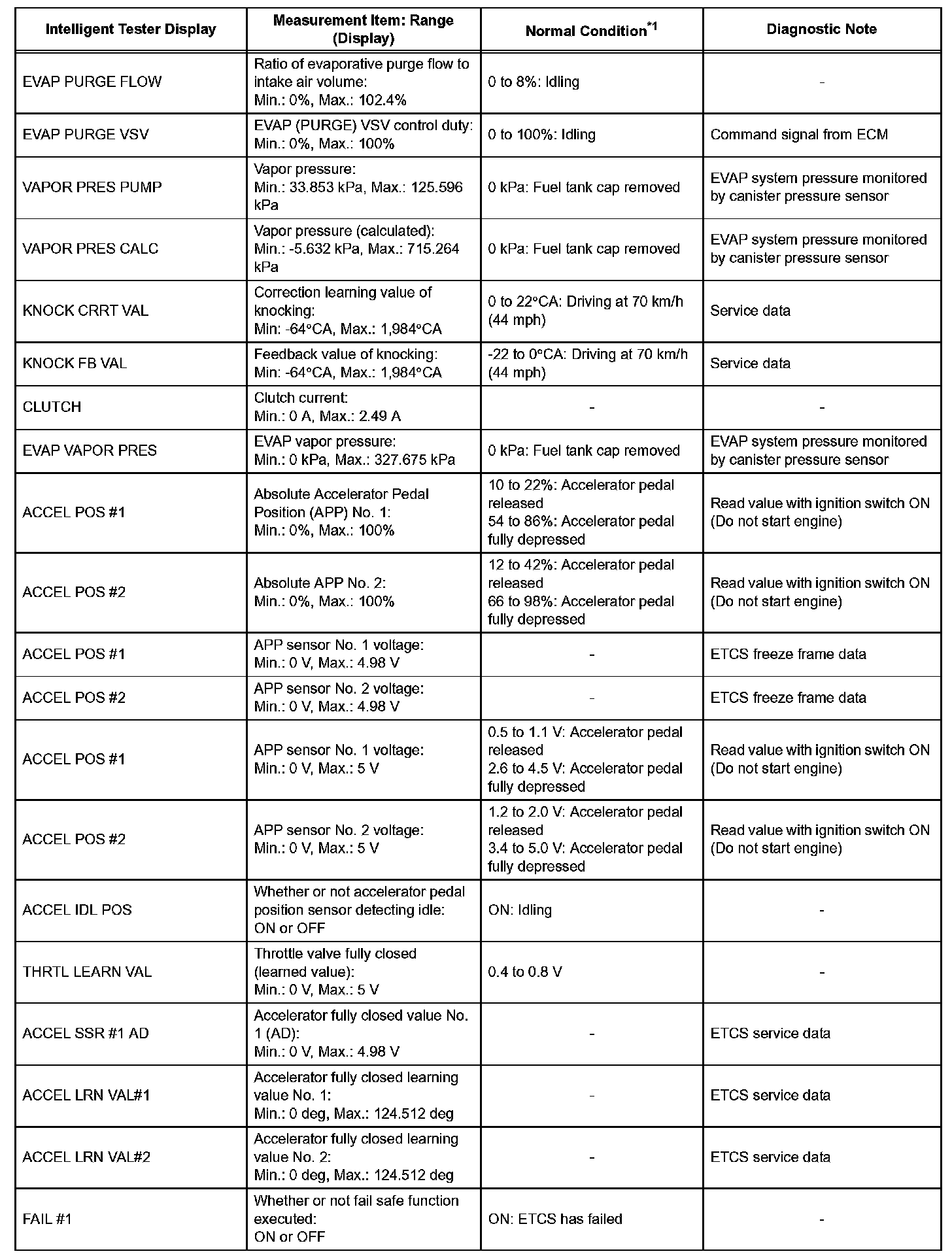 NOTE: In the table, the values listed under Normal Condition are reference only. Do not depend solely on these values when determining whether or not a part is faulty.