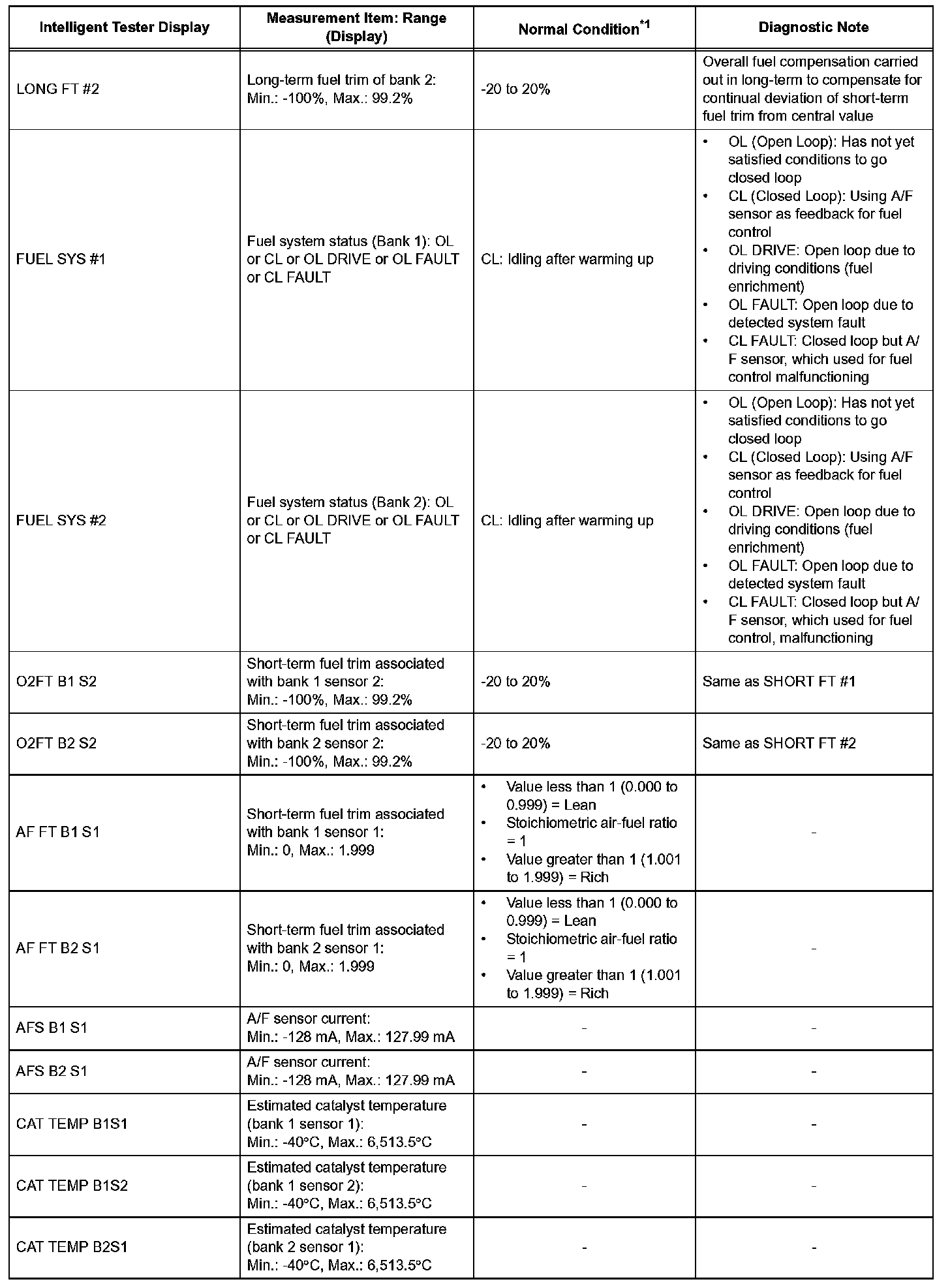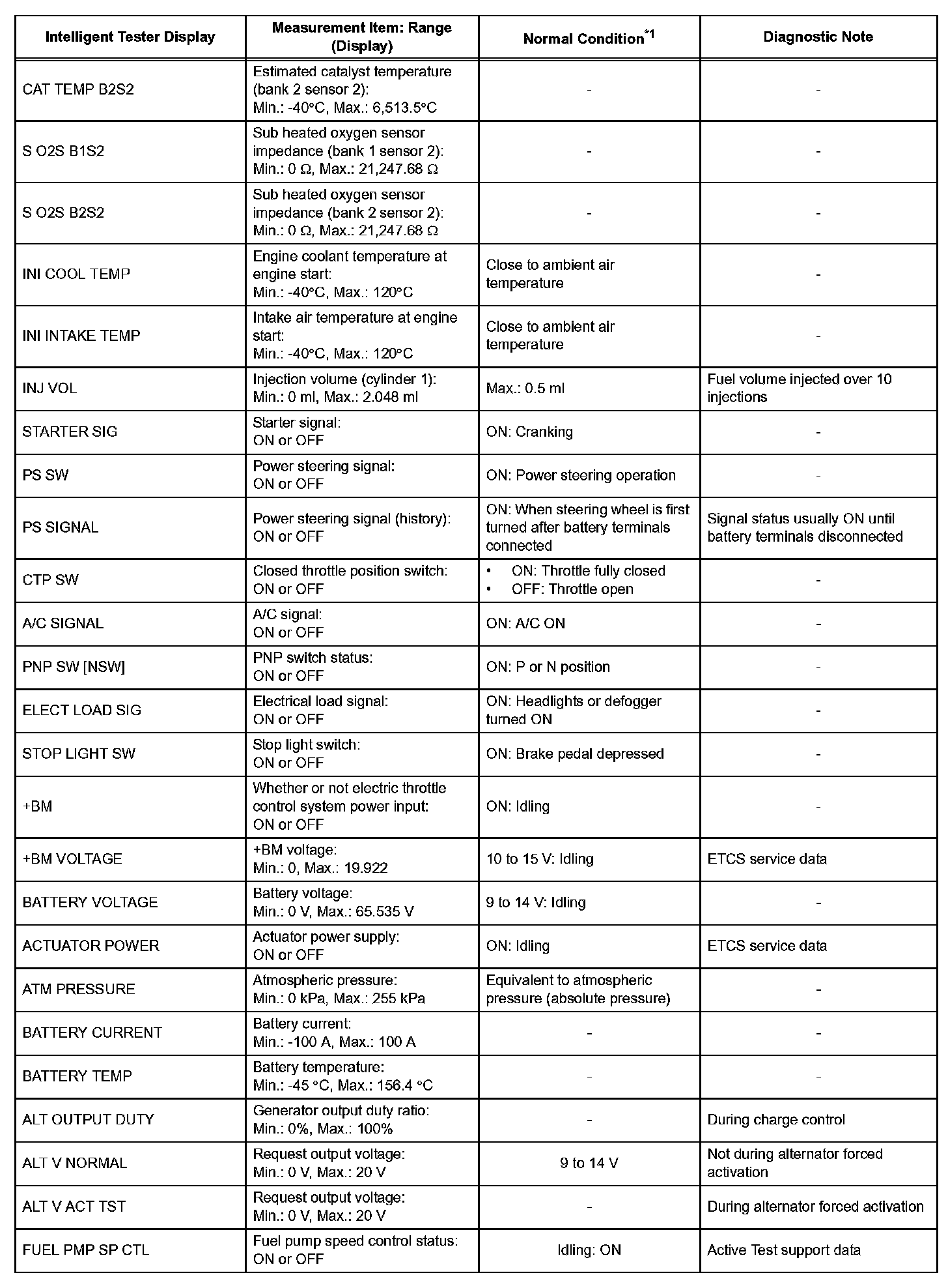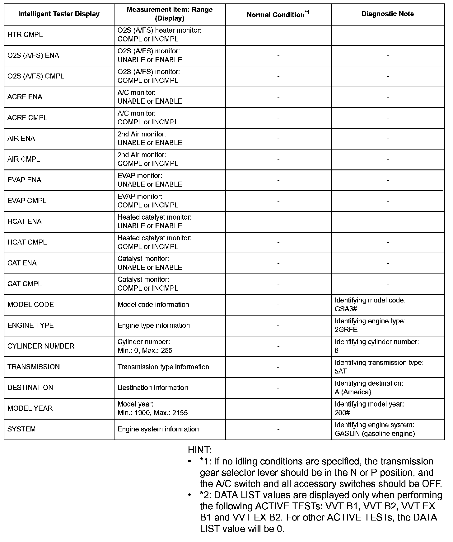 DATA LISTHINT: By reading the DATA LIST displayed on an intelligent tester, you can check values, including those of the switches, sensors, and actuators, without removing any parts. Reading the DATA LIST as the first step in troubleshooting is one method of shortening diagnostic time.