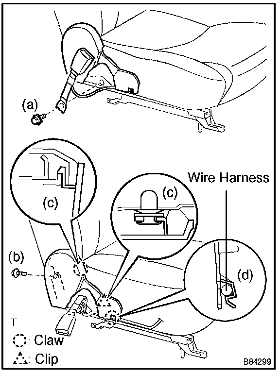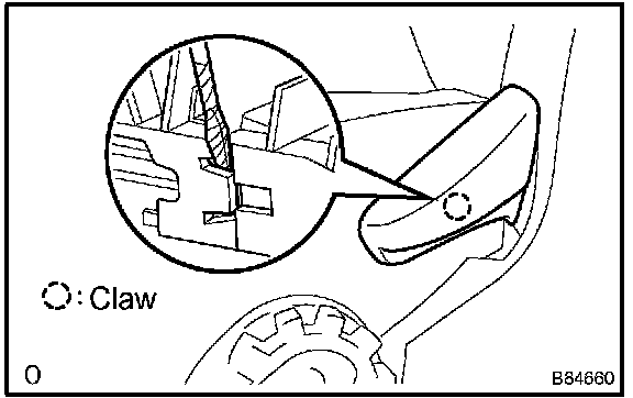 c. Using a screwdriver, disengage the claw and clip. Then remove the cushion shield inner LH together with the wire harness of the inner belt.