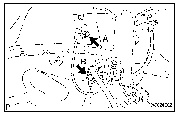 b. Install the sensor harness clamp with the 2 bolts "A" and "B" to the body and shock absorber.