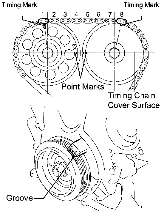 (2) Check that the point marks of the camshaft timing gears are in a straight line on the timing chain cover surface as shown in the illustration. If not, turn the crankshaft 1 revolution (360°) to align the marks as above.