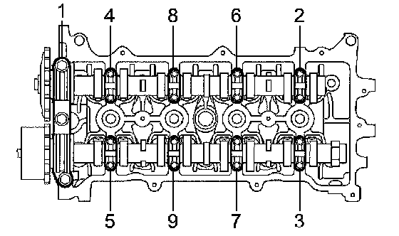 (b) Remove the 9 bearing caps, then remove the 2 camshafts from the cylinder head.