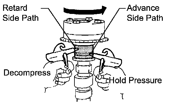 (5) When the camshaft timing gear comes to the most advanced position, release the air pressure of the timing retard side path, then release that of the timing advance side path.