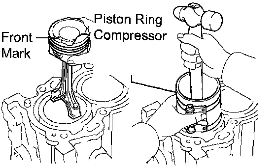 (c) Using a piston ring compressor, correctly push into the numbered piston and connecting rod assemblies each cylinder with the front mark of the piston facing forward.