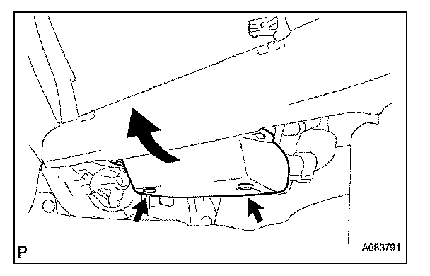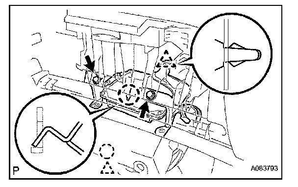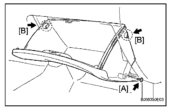 b. Deform the upper part of the glove compartment door assembly to release the stoppers [B].