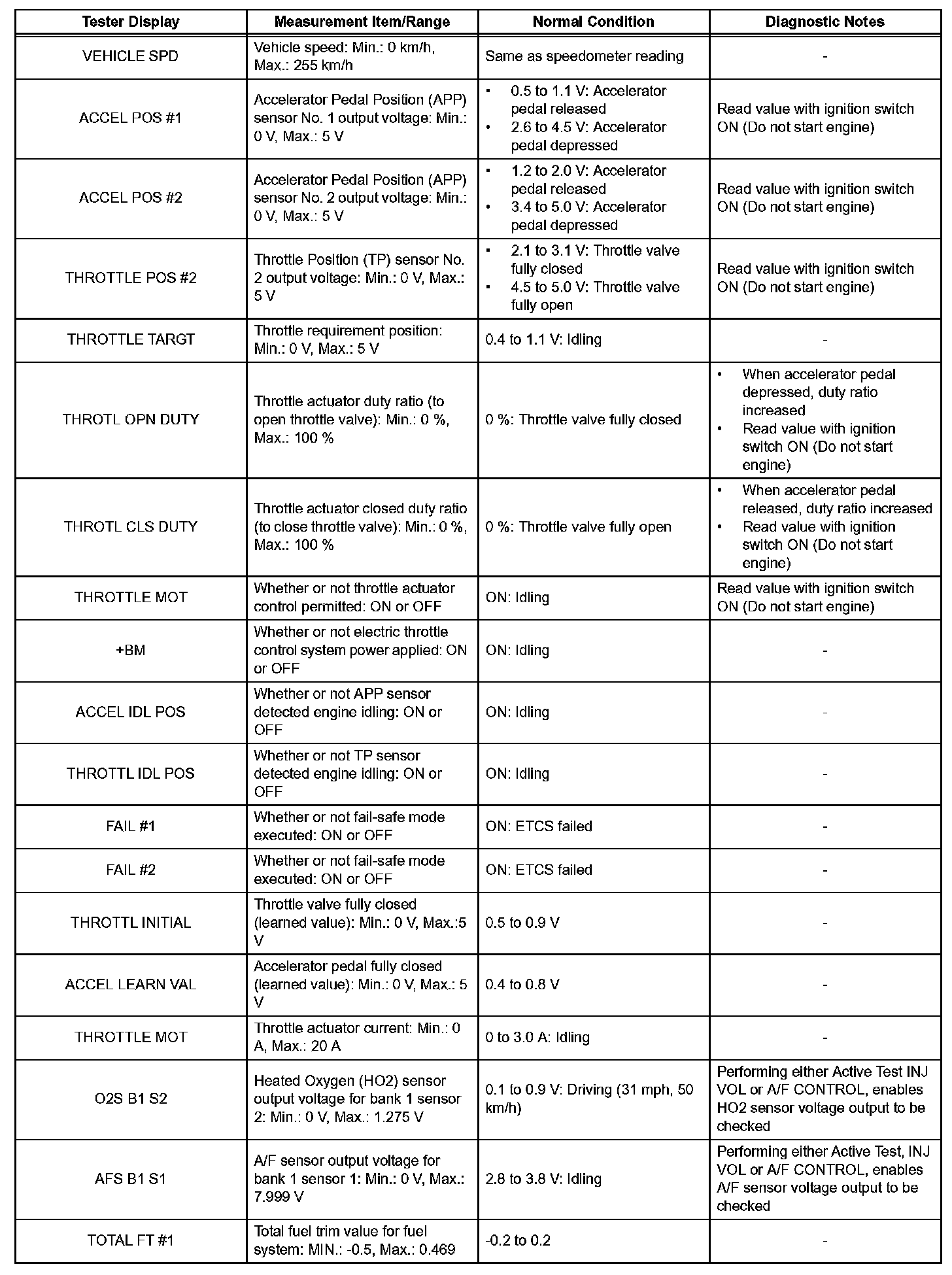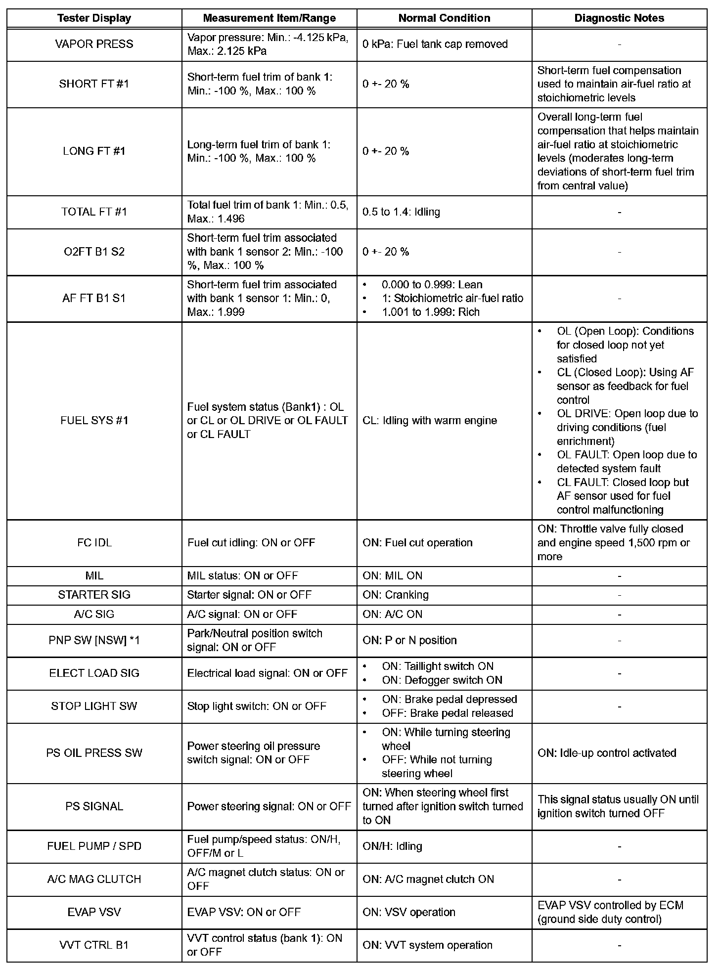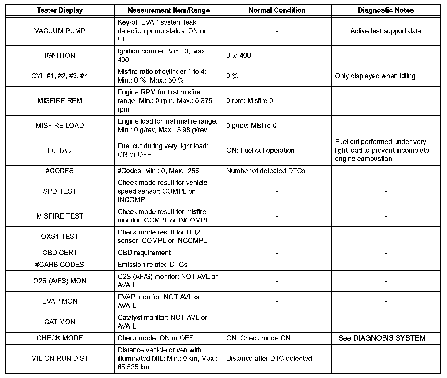 DATA LISTHINT: By reading the DATA LIST displayed on an intelligent tester or OBD II scan tool, you can check values, including those of the switches, sensors, and actuators, without removing any parts. Reading the DATA LIST as the first step of troubleshooting is one method of shortening diagnostic time.