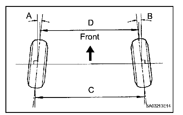 If the toe-in is not within the specified range, inspect the suspension parts and replace parts if necessary.