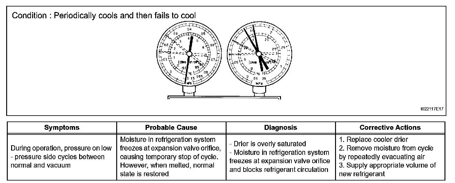 2. The A/C system periodically changes between normal and improper function due to moisture in the refrigerant system.