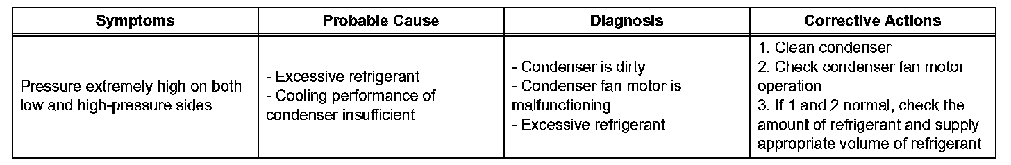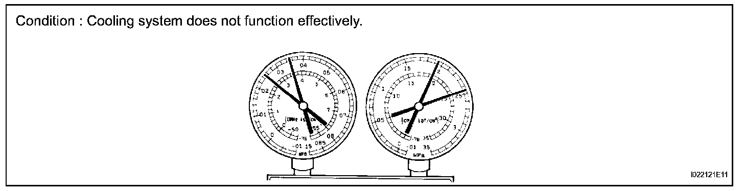 6. The A/C system does not function effectively due to overcharged refrigerant or insufficient cooling of the condenser.