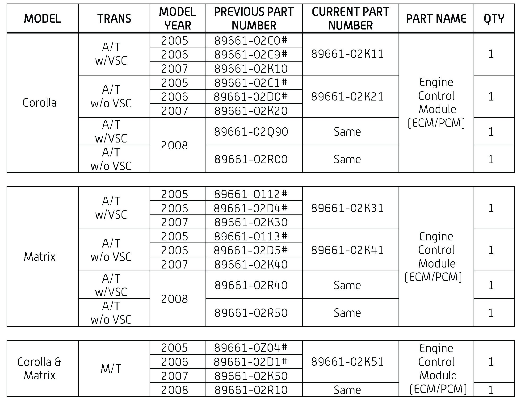2005 - 2007 model year Corolla/Matrix vehicles are NOT compatible with 2008 model year ECMs.