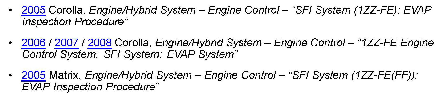 This TSB applies to 2005 - 2006 MY Corolla and Matrix vehicles that are currently equipped with a 2007 MY ECM.