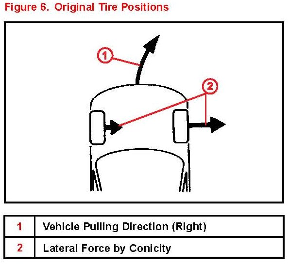 - The direction of lateral force from tire conicity becomes reversed when the left and right tires are switched. Therefore if the pulling direction changes when the tires are switched it can be concluded that vehicle pulling is caused by tire conicity.
