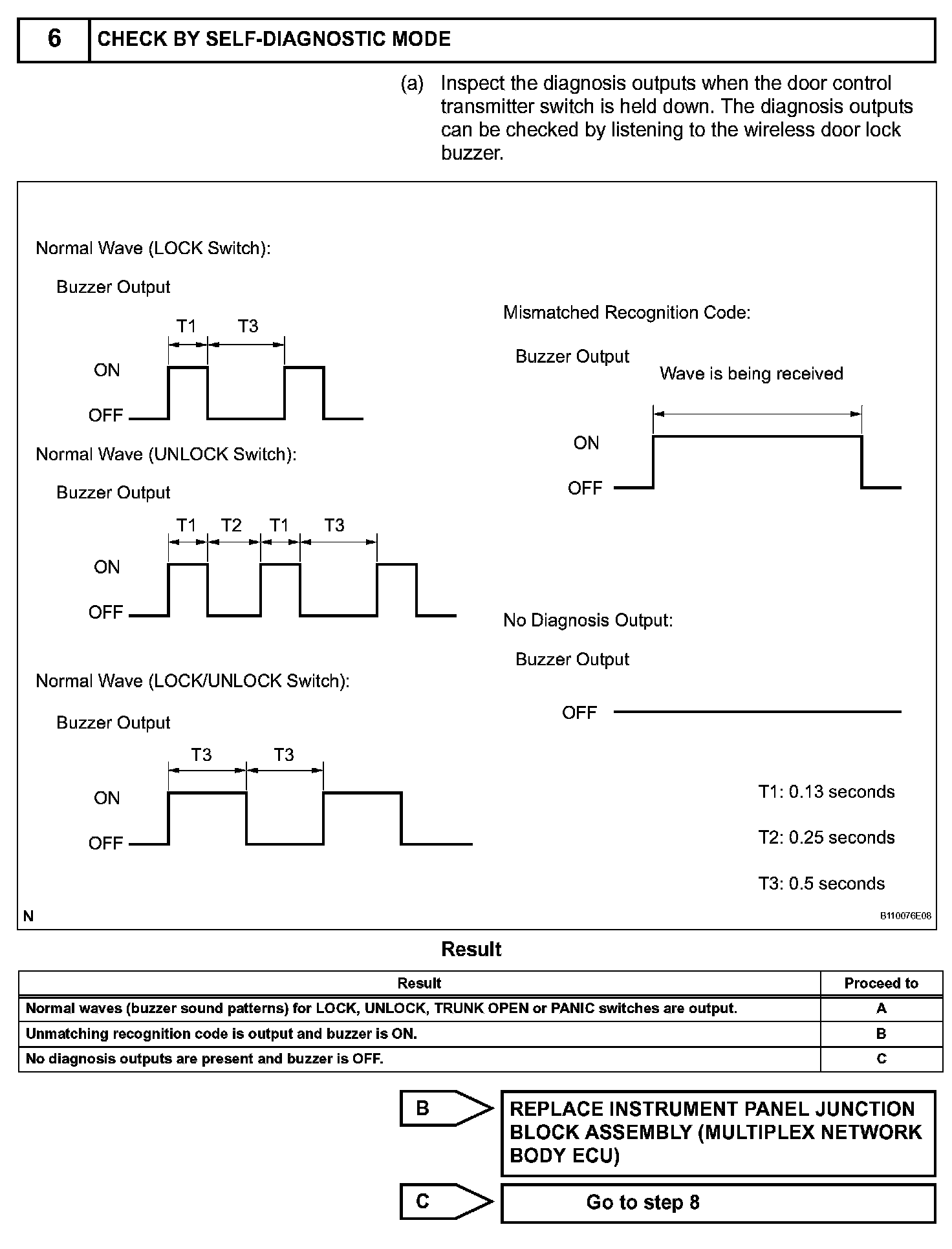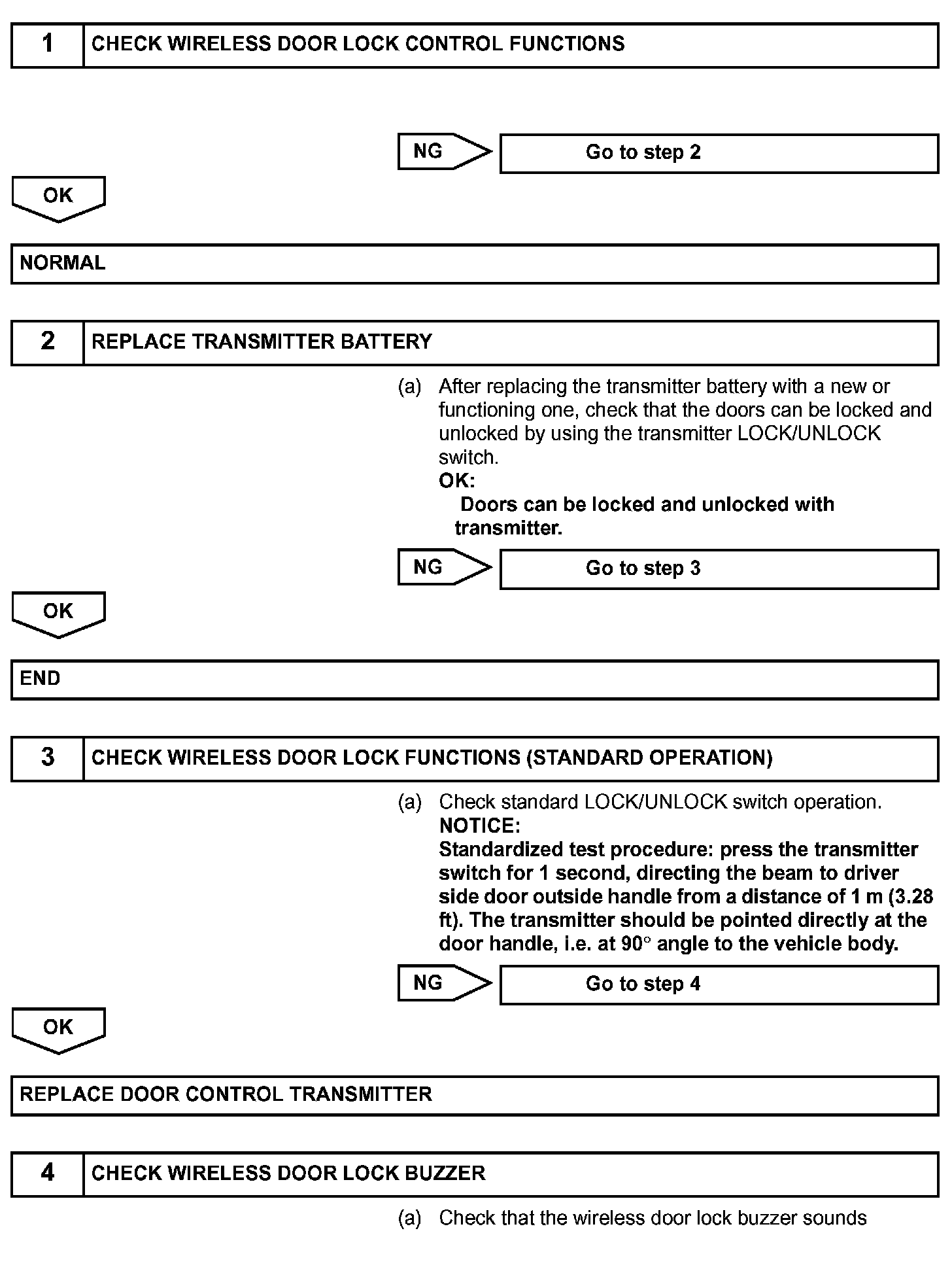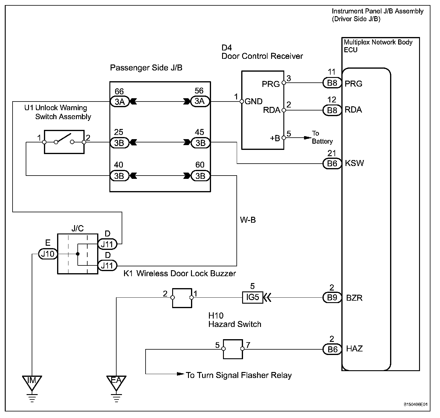 The door control receiver receives signals from the transmitter and sends these signals to the multiplex network body ECU. The multiplex network body ECU then controls all the doors by sending LOCK/ UNLOCK signals to each door lock actuator, buzzer signals to the wireless door lock buzzer and headlight/taillight and hazard warning signals to the turn signal flasher relay.