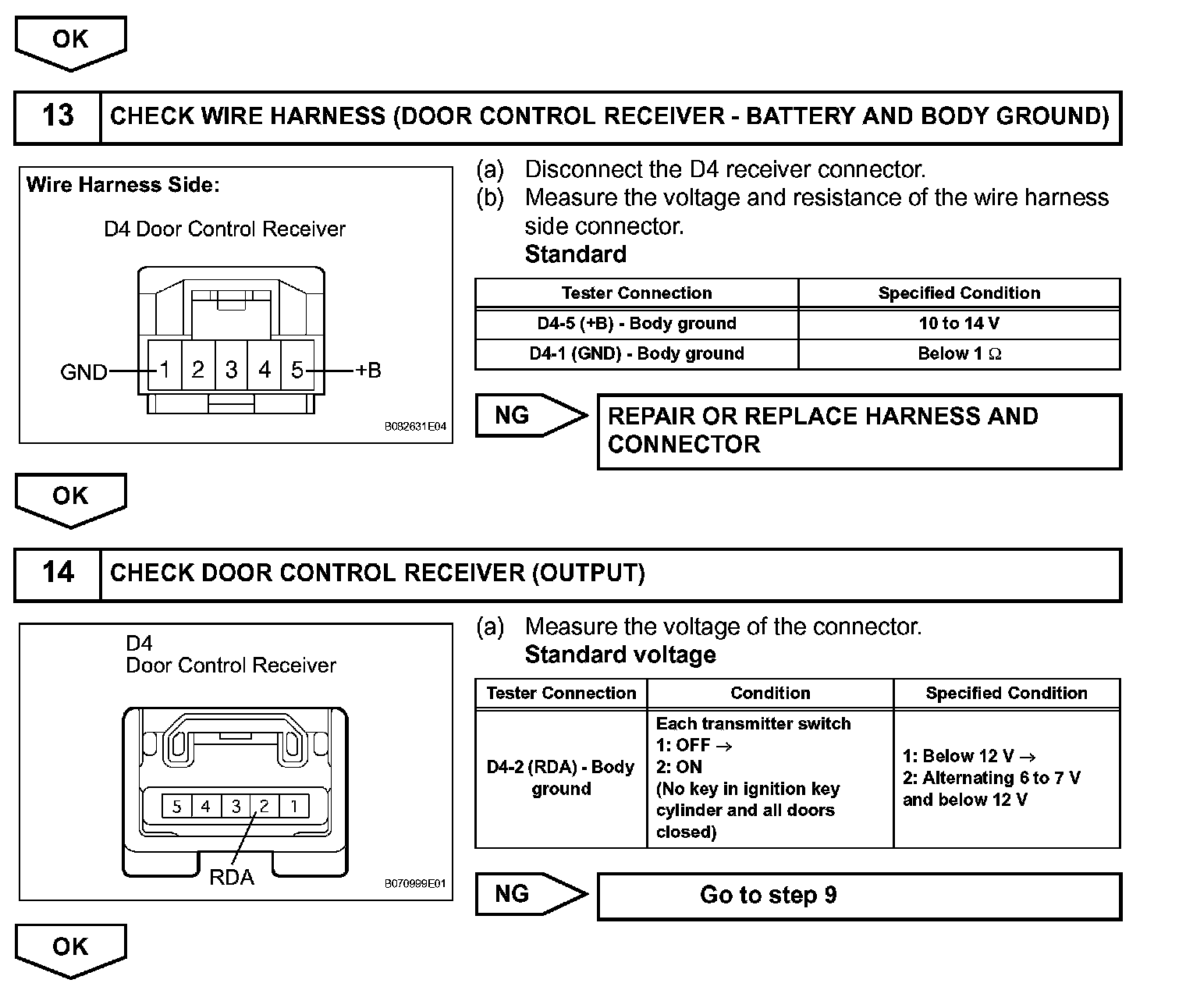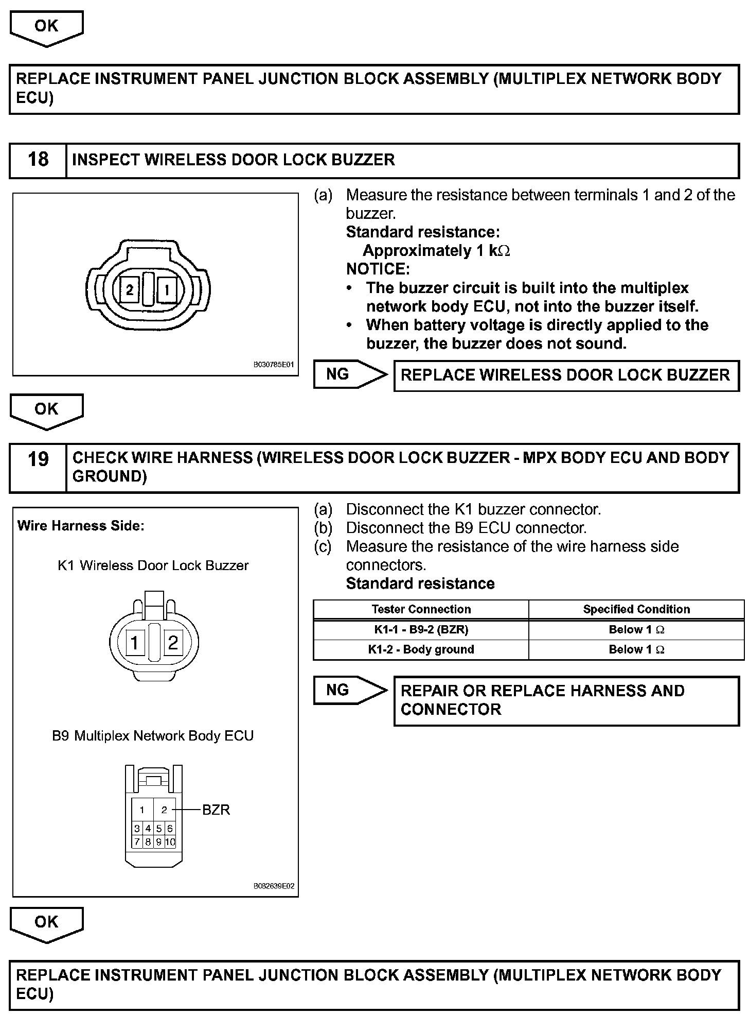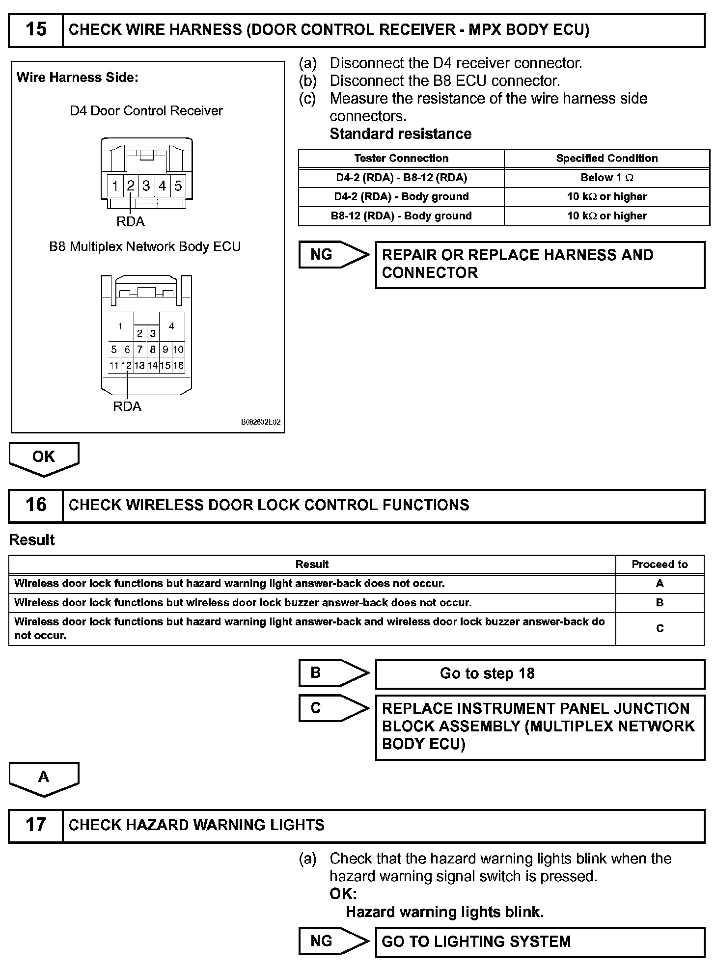 The door control receiver receives signals from the transmitter and sends these signals to the multiplex network body ECU. The multiplex network body ECU then controls all the doors by sending LOCK/ UNLOCK signals to each door lock actuator, buzzer signals to the wireless door lock buzzer and headlight/taillight and hazard warning signals to the turn signal flasher relay.