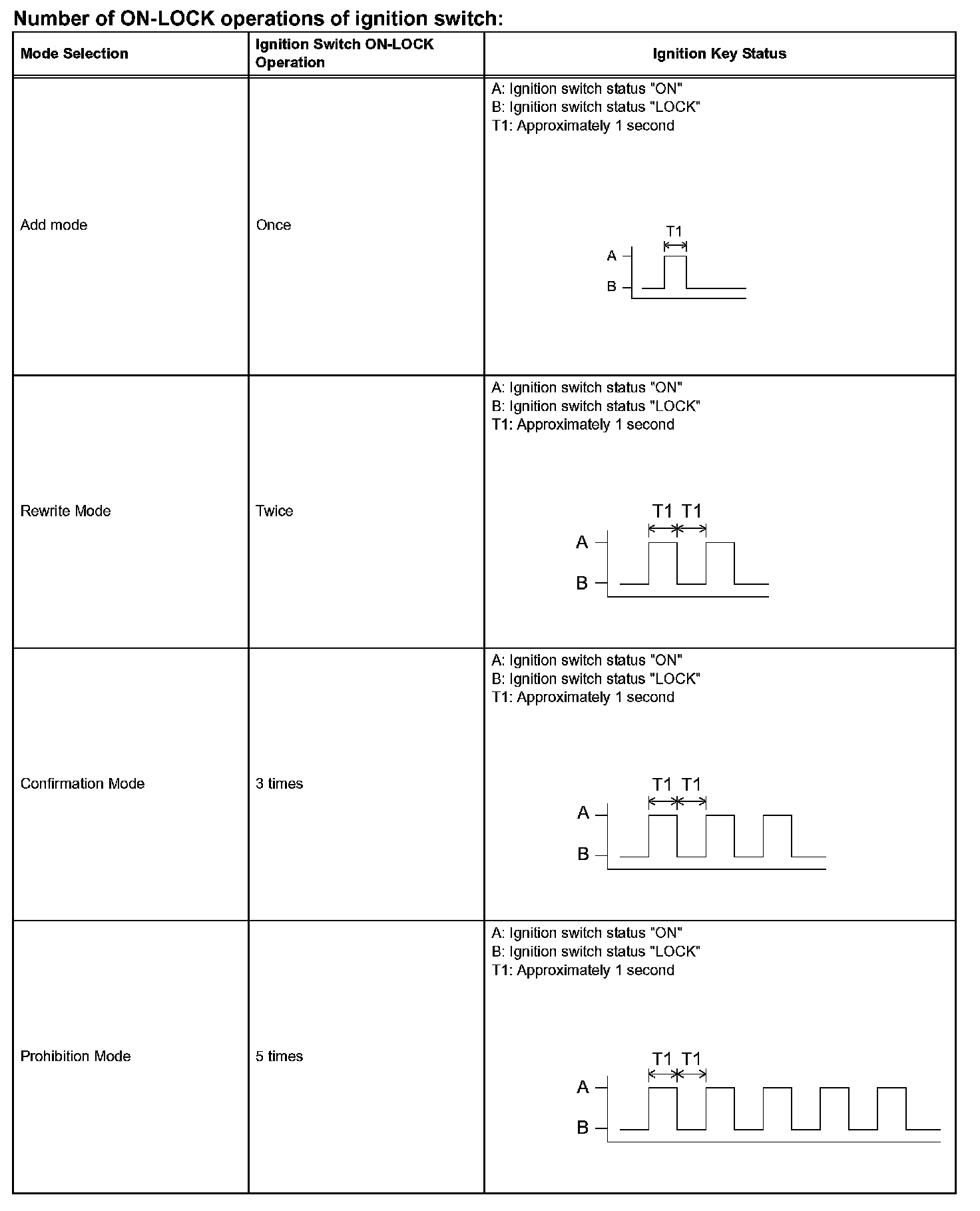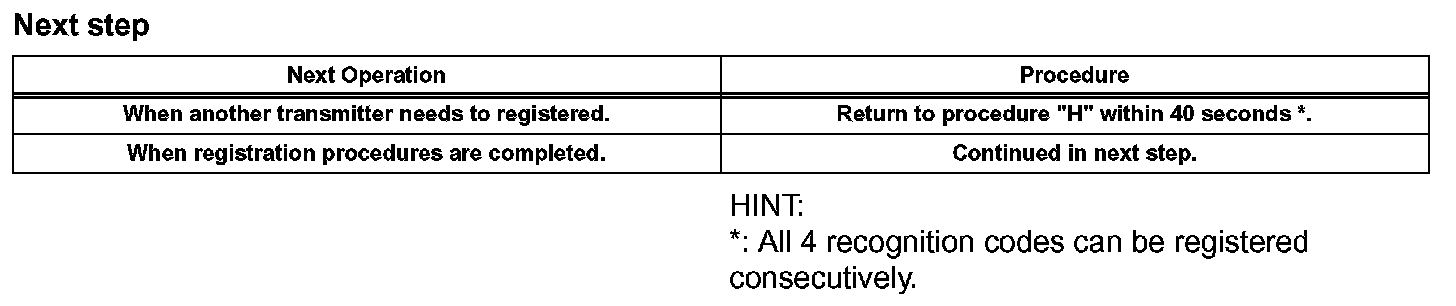 h. Turn the ignition switch from LOCK to ON and back to LOCK at approximately 1 second intervals according to the number of times shown in the table.