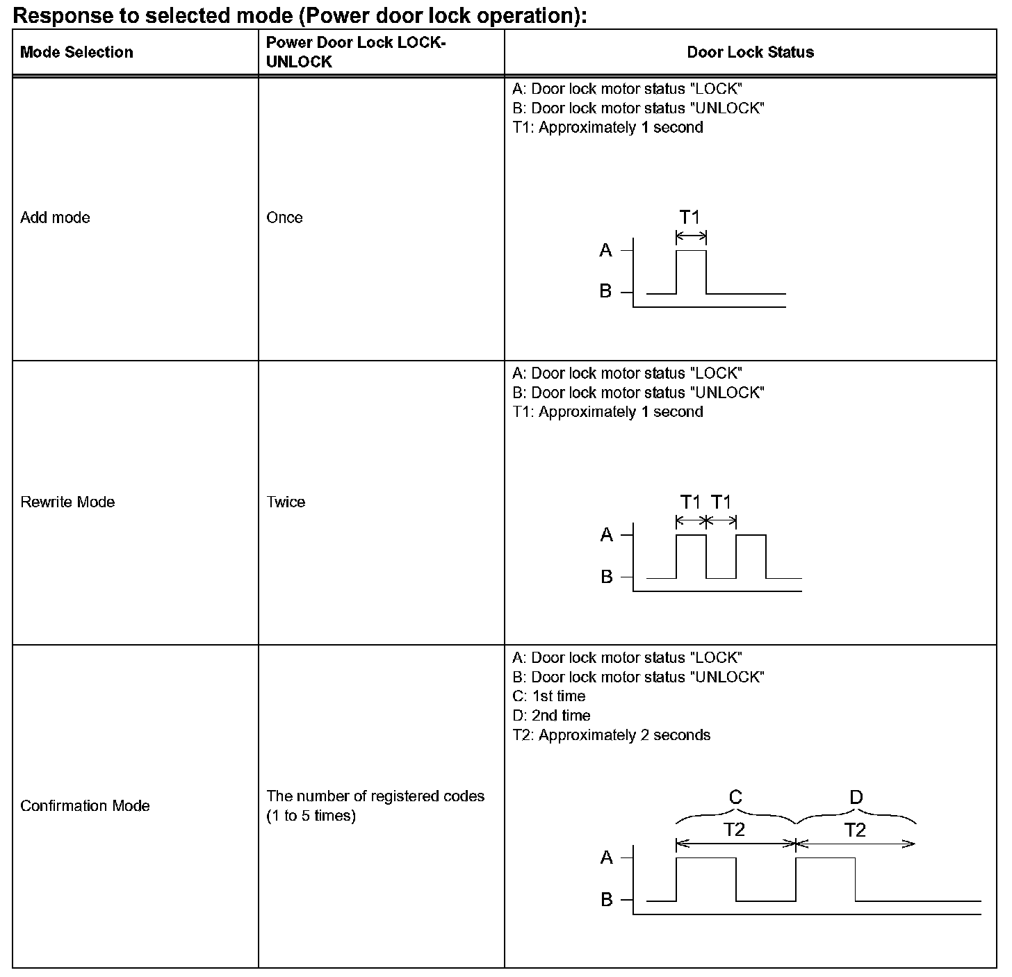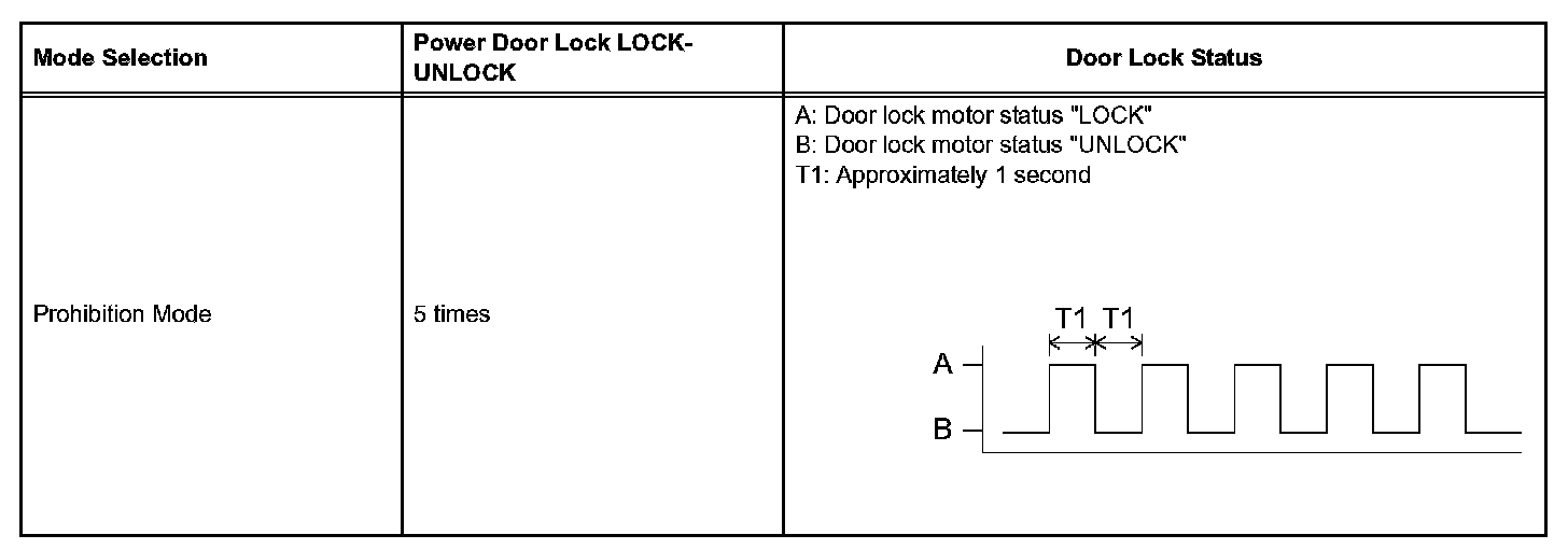 HINT: If the number of the ON-LOCK operations of the ignition switch is 0, 4, 6 or more, there will be no response (power door LOCK-UNLOCK operation) to show which mode has been selected.