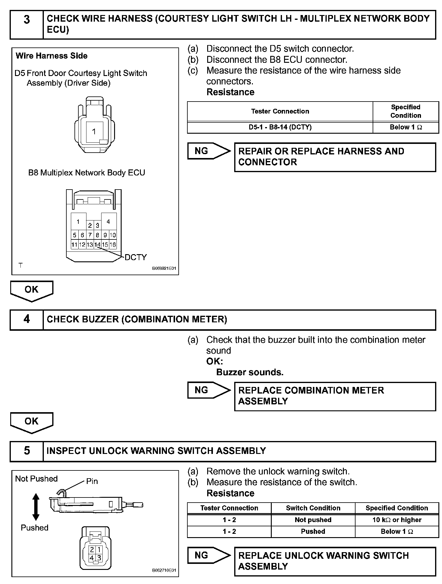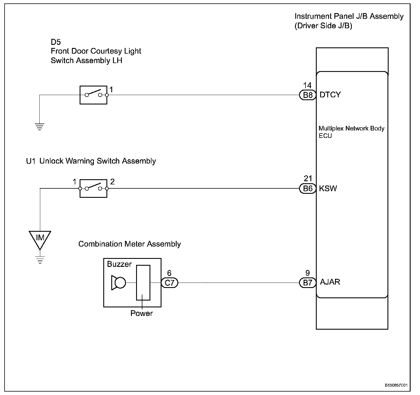 The key reminder buzzer sounds when the driver side door is opened while the ignition switch is OFF and the key is in the ignition key cylinder. The key reminder buzzer is activated when the multiplex network body ECU sends a key switch signal and driver side courtesy switch signal to the combination meter.