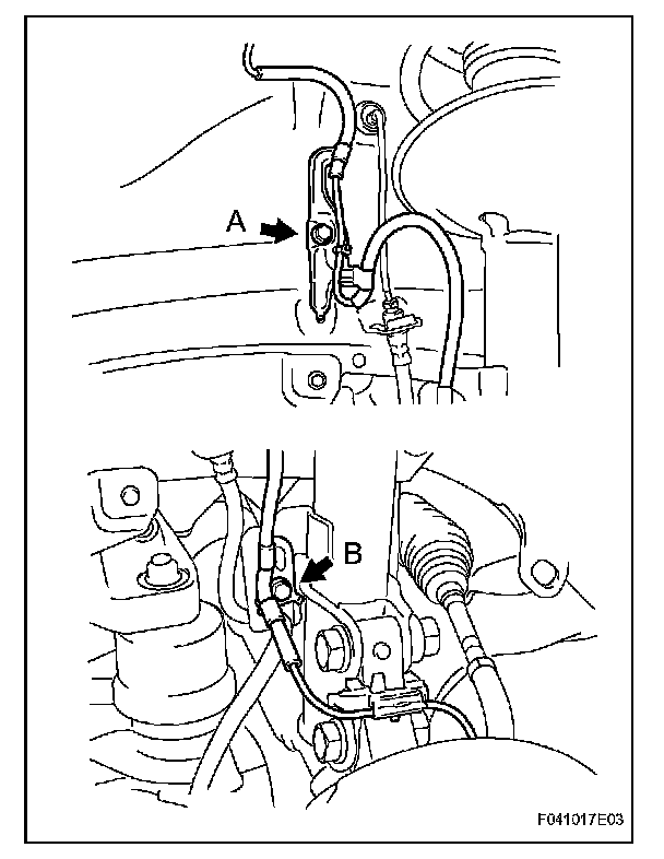 b. Install the sensor harness clamps with the 2 bolts "A" and "B" to the body and shock absorber.