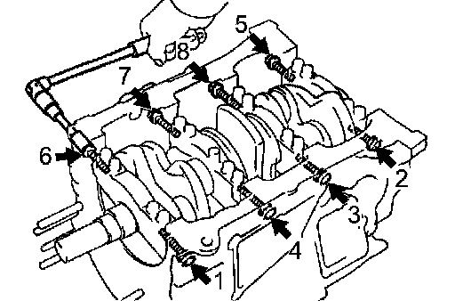 (a) Uniformly loosen and remove the 8 main bearing cap bolts and seal washers in the sequence shown in the illustration (Procedure "A").