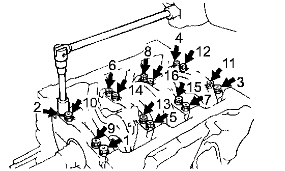 (b) Uniformly loosen and remove the 16 main bearing cap bolts the sequence shown in the illustration (Procedure "B").