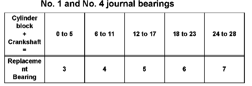 HINT: If using a bearing, replace it with one that has the same number. If the number of the bearing cannot be determined, select the correct bearing by adding together the numbers imprinted on the cylinder block and crankshaft, then refer to the table for the appropriate bearing number. The No. 1 and No. 4 journal bearings have 5 standard bearing sizes, marked 3, 4, 5, 6 and 7 accordingly. The No. 2 and No. 3 journal bearings have 5 standard bearing sizes, marked 1, 2, 3, 4 and 5 accordingly.