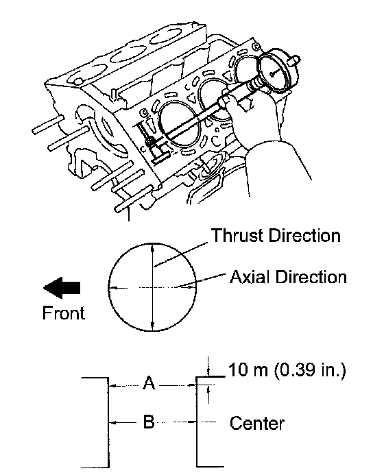 (a) Using a cylinder gauge, measure the cylinder bore diameter at positions A and B in the thrust and axial directions.