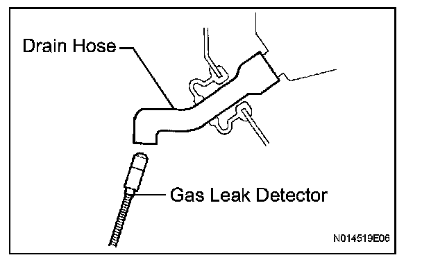 - When bringing the gas leak detector close to the drain hose, make sure that the gas leak detector does not react to volatile gases. If it is not possible to avoid interference from volatile gases, the vehicle should be lifted up to allow testing.