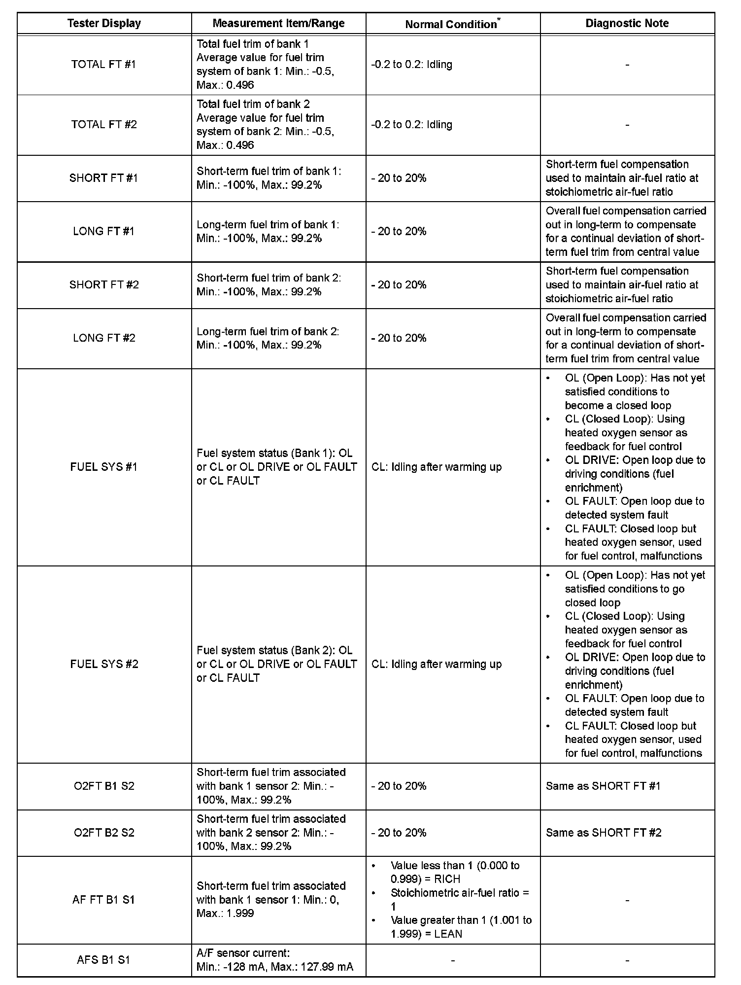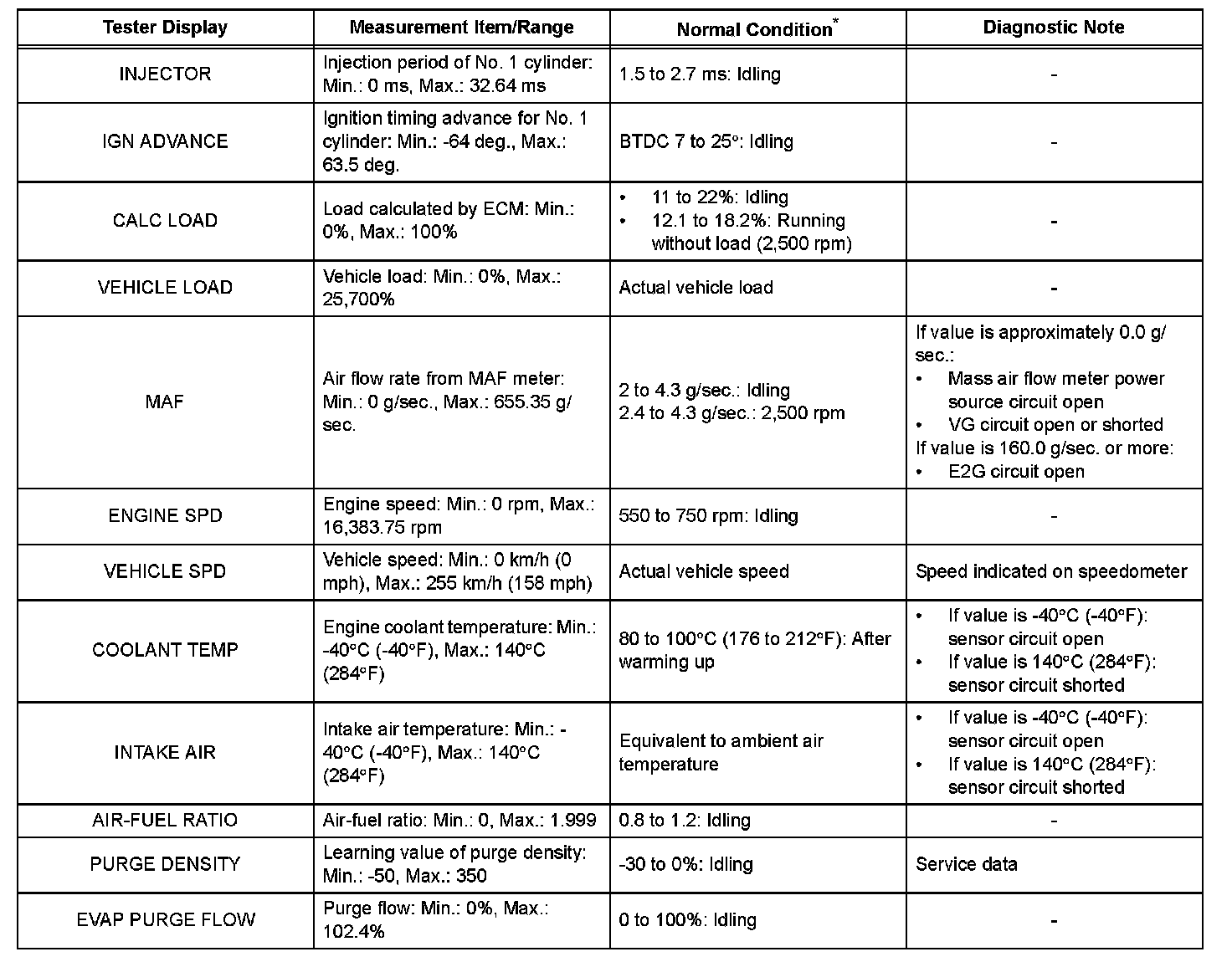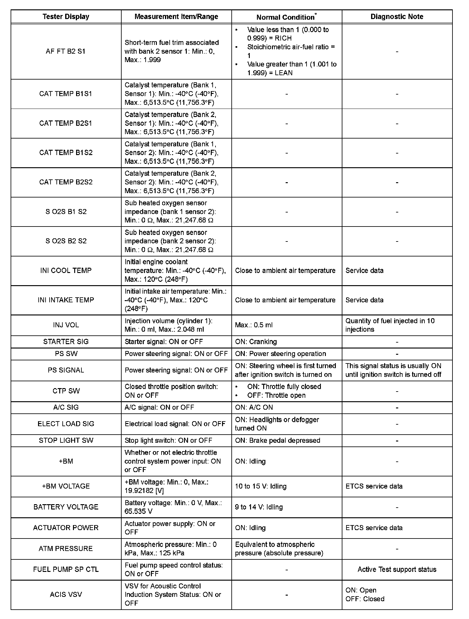 DATA LISTHINT: Reading the DATA LIST displayed on an intelligent tester enables values, including those of the switches, sensors, and actuators, to be checked without removing any parts. Reading the DATA LIST as the first step in troubleshooting is one method to shorten diagnostic time.