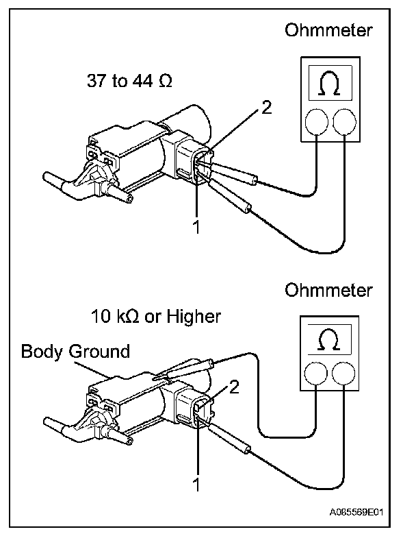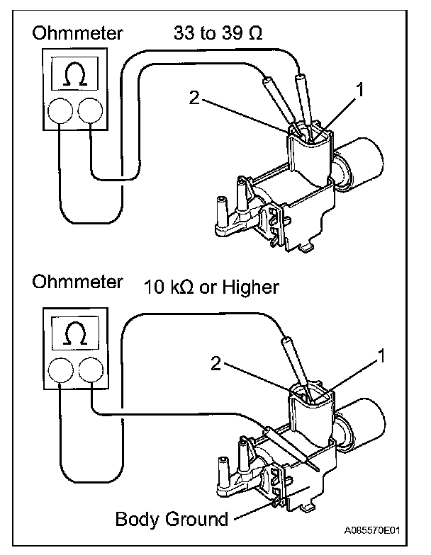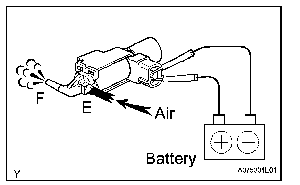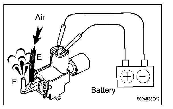 2. Apply battery voltage across the terminals. Check that air flows from port E to port F.