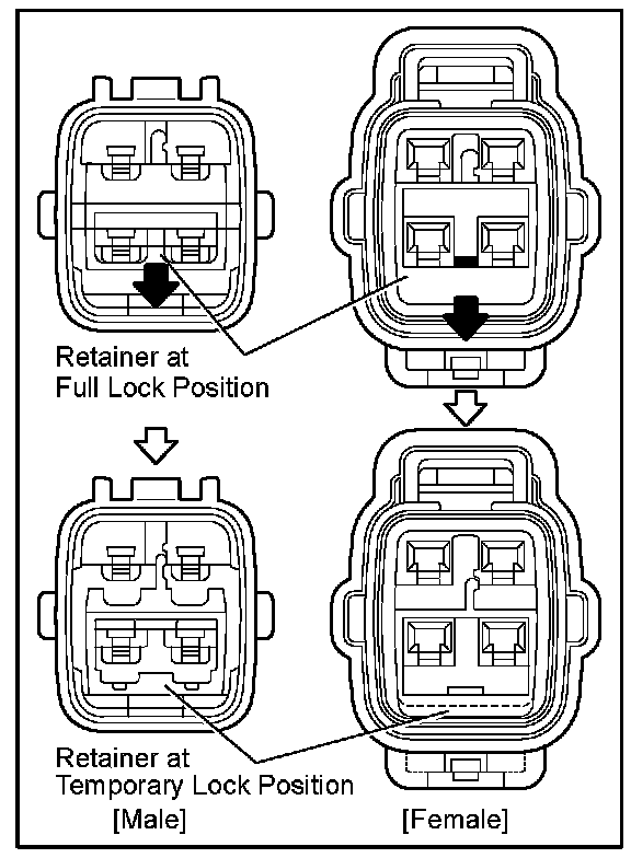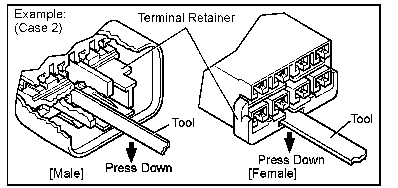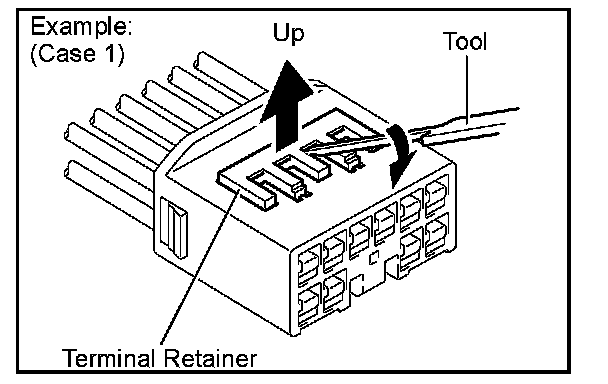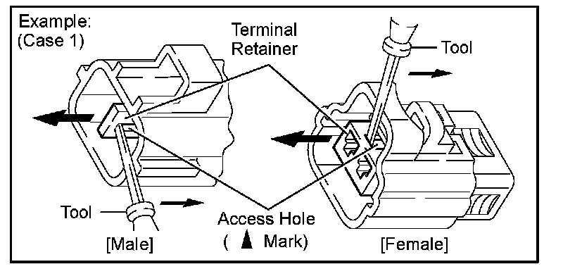 Insert the special tool into the terminal retainer access hole ( Mark) and pull the terminal retainer up to the temporary lock position.