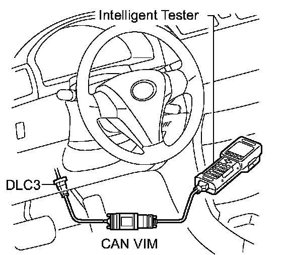 HINT: The DLC3 is the interface prepared for reading various data from the vehicle's ECM. After connecting the cable of the intelligent tester to the CAN VIM, turn the ignition switch ON and turn the tester ON. If a communication failure message is displayed on the tester screen (on the tester: UNABLE TO CONNECT TO VEHICLE), a problem exists in either the vehicle or tester. In order to identify the location of the problem, connect the tester to another vehicle.