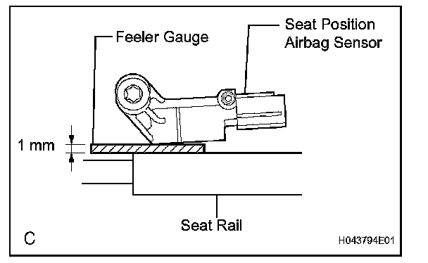c. Using a feeler gauge 1 mm (0.039 in.), install the seat position airbag sensor.