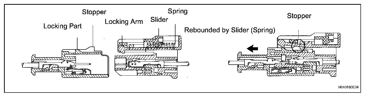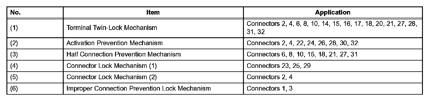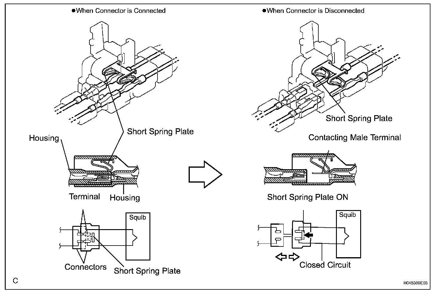 All connectors with an activation prevention mechanism contain a short spring plate. When these connectors are disconnected, the short spring plate creates a short circuit by automatically connecting the positive (+) and negative (-) terminals of the squib.