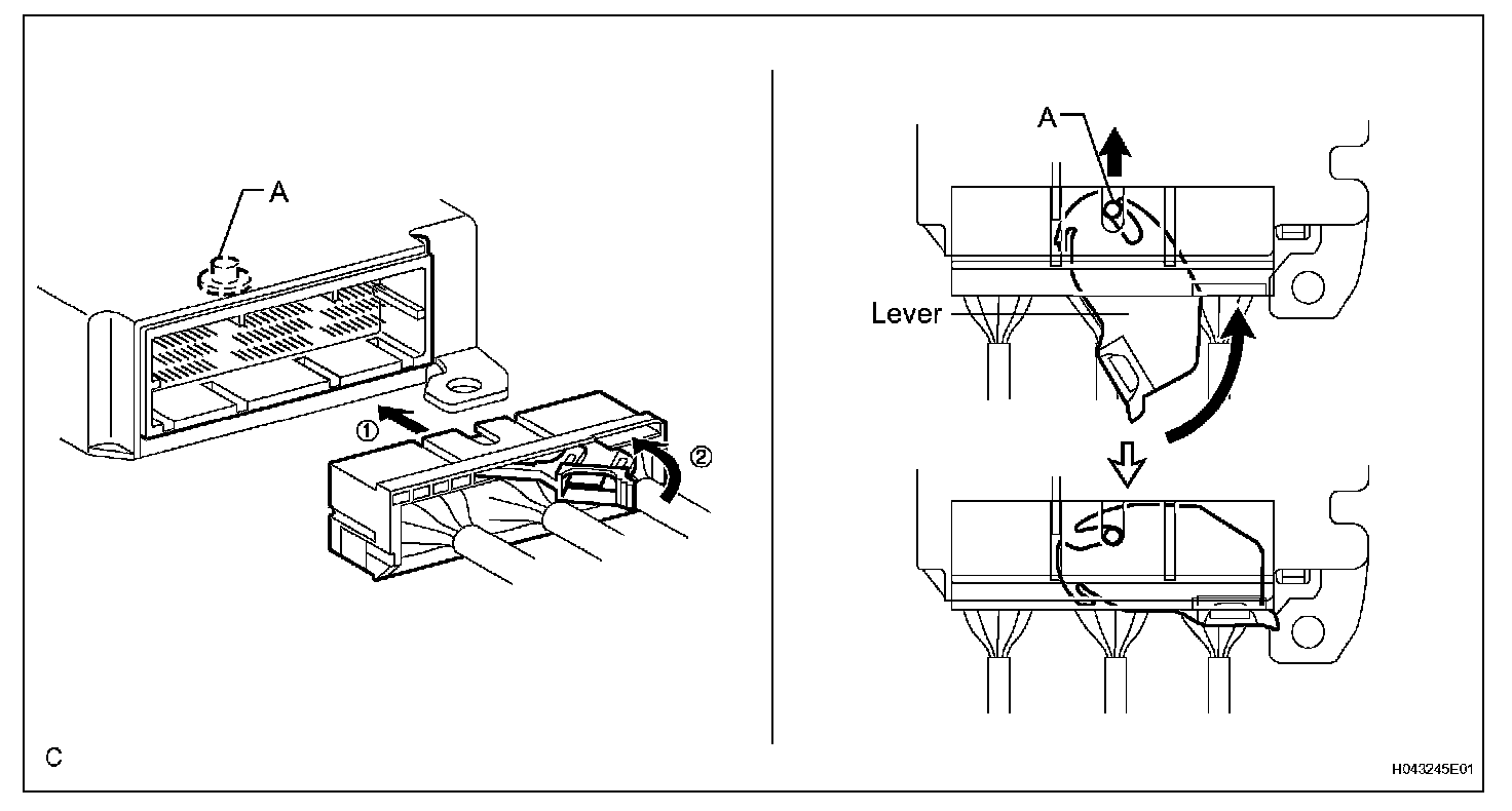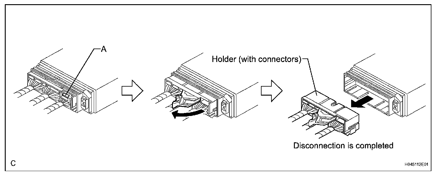 a. Pull the lever by pushing part A as shown in the illustration and disconnect the holder (with connectors).