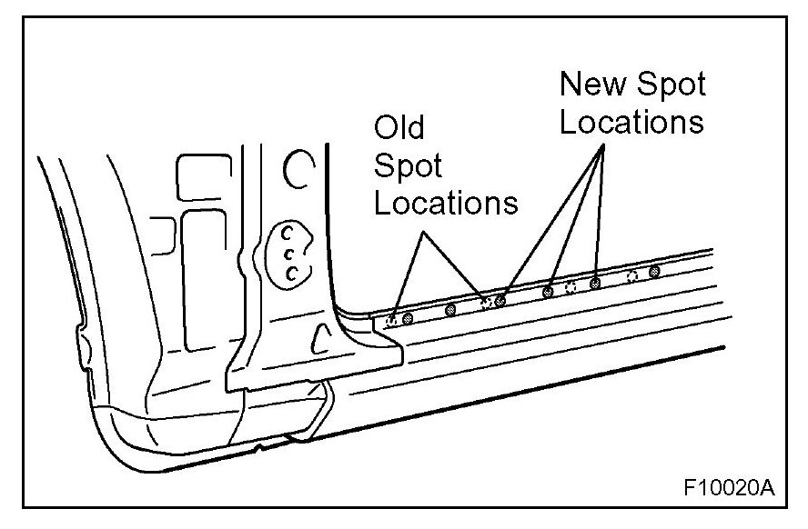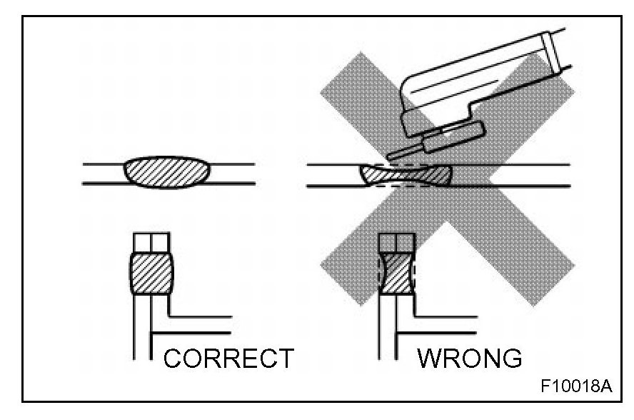 2. Plug welding should be done with a MIG (Metal Inert Gas) welder. Do not gas weld or braze panels at areas other than specified.