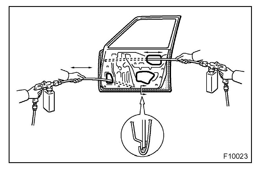 1. To preserve impossible to paint areas from corrosion, always apply sufficient anti-rust agent (wax) to the inside of the hemming areas of the doors and hoods, and around the hinges, or the welded surfaces inside the boxed cross-section structure of the side member, body pillar, etc.