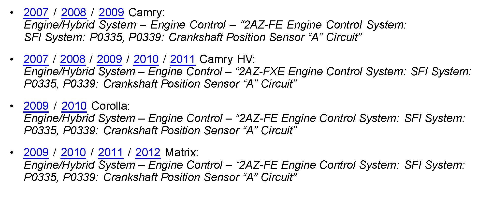 Some 2006 - 2012 model year vehicles equipped with the 2AZ engine may exhibit an intermittent MIL "ON" condition with Diagnostic Trouble Code (DTC) P0335 (Crankshaft Position Sensor "A" Circuit) stored. The intake camshaft gear assembly has been improved to help prevent this condition.
