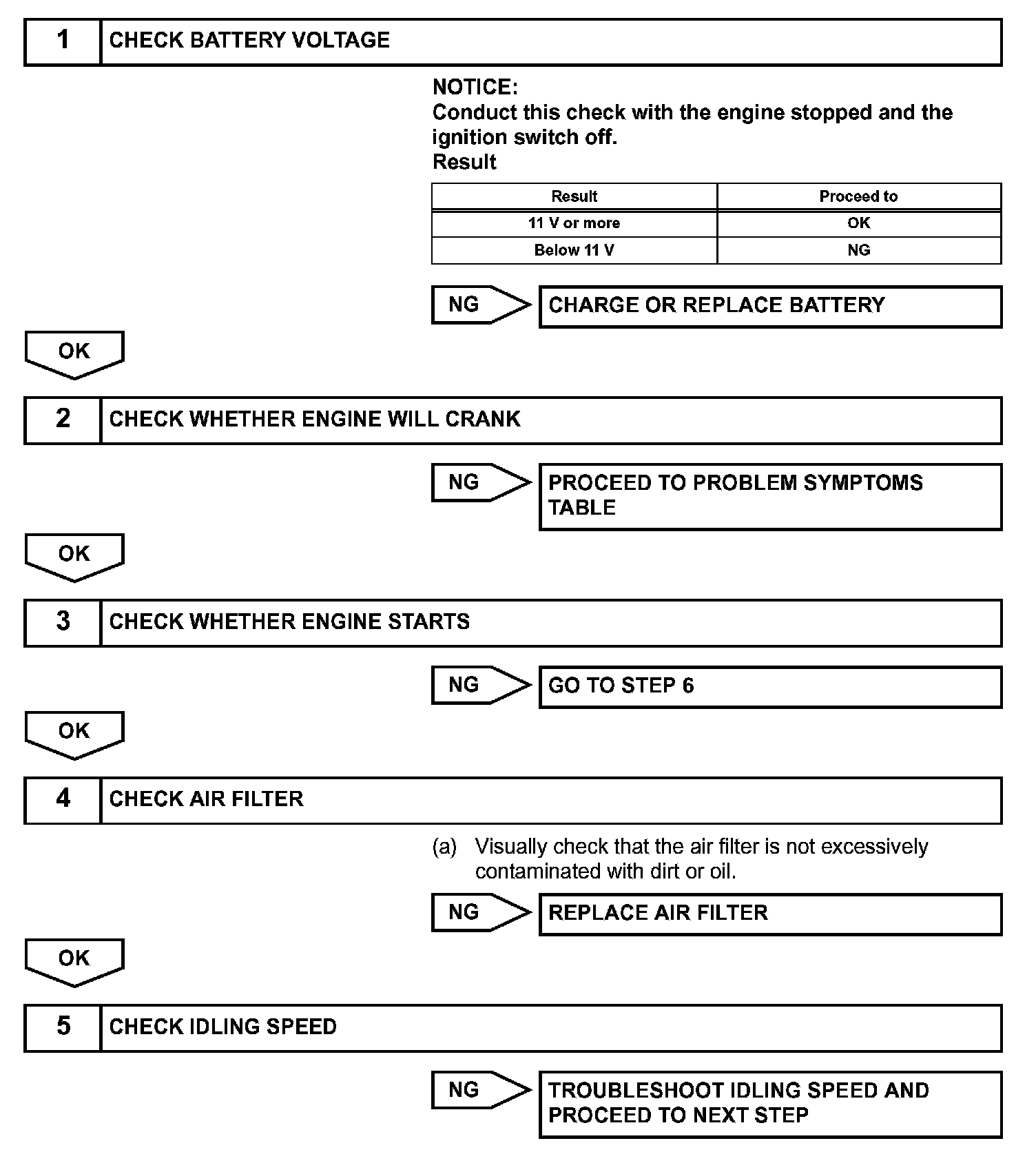 When a malfunction is not confirmed by the DTC check, troubleshooting should be carried out in all circuits considered to be possible causes of the problem. In many cases, by carrying out the basic engine check shown in the given flowchart, the location of the problem can be found quickly and efficiently. Therefore, using this check is essential when engine troubleshooting.