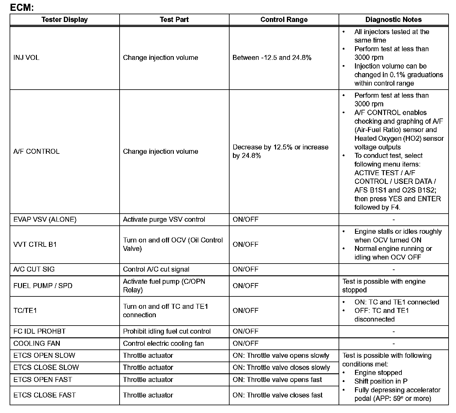 e. Perform the ACTIVE TEST by referring to the table.