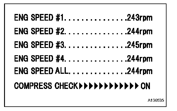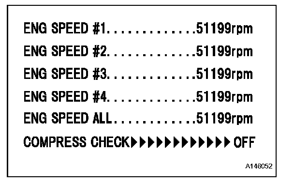 HINT: After performing the procedure, the ACTIVE TEST'S COMPRESS CHECK will start. Fuel injection for all cylinders is prohibited, and each cylinder's engine rpm measurement will enter standby mode.