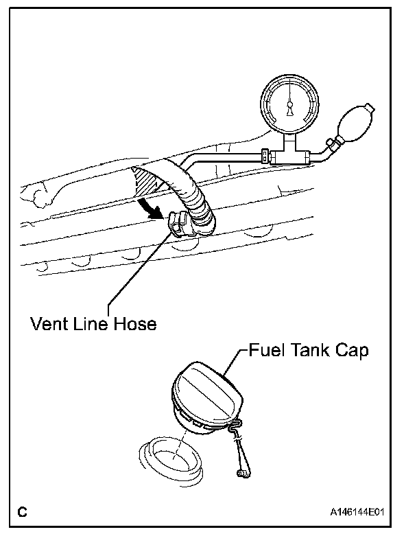 d. Apply pressure of 4 kPa (41 gf/sq.cm, 0.58 psi) to the vent port of the fuel tank.