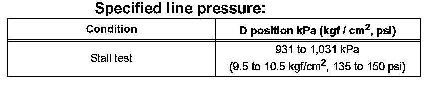(11) Firmly depress the brake pedal, shift to the D position, depress the accelerator pedal all the way down and check the line pressure while the stall test is performed.
