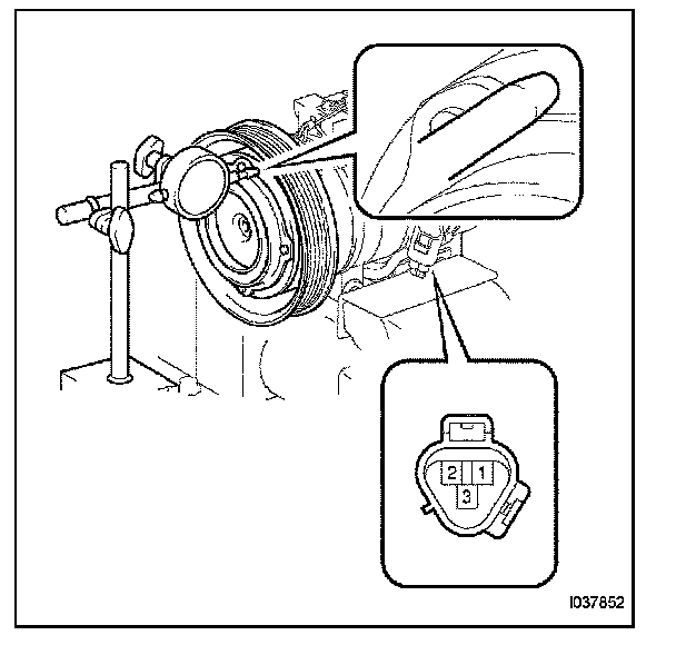 b. Connect the battery positive lead to terminal 3 of the magnet clutch connector and the negative lead to the earth wire. Turn the magnet clutch on and off and measure the clearance.